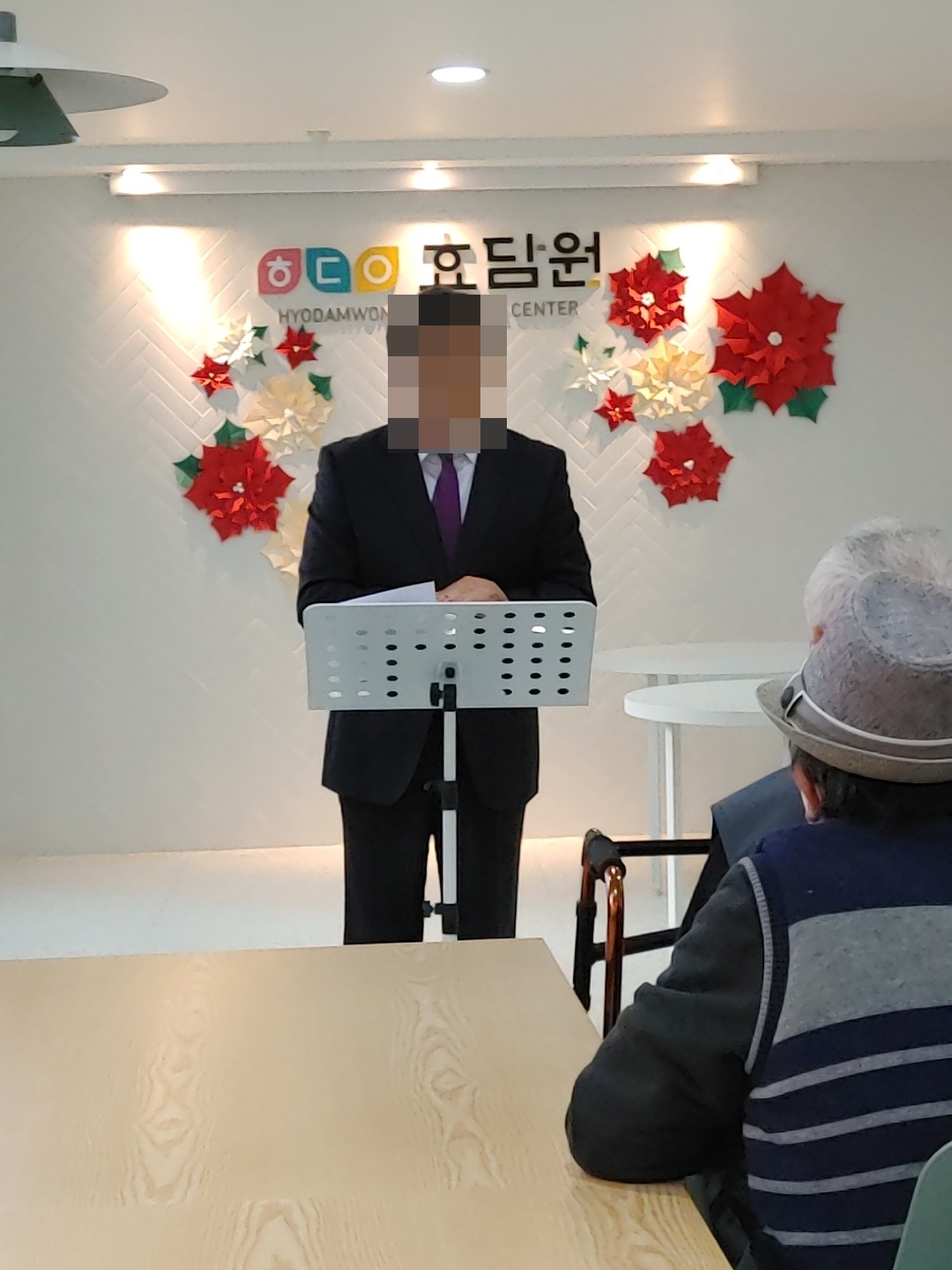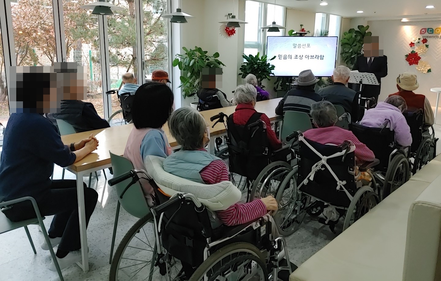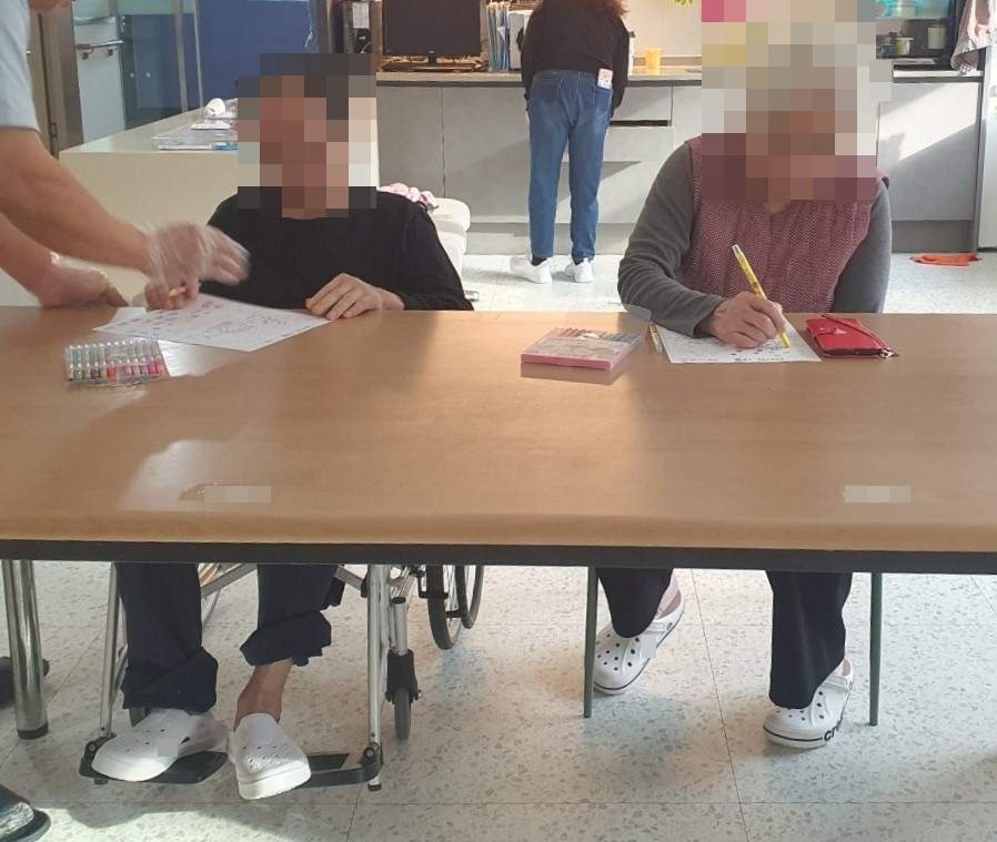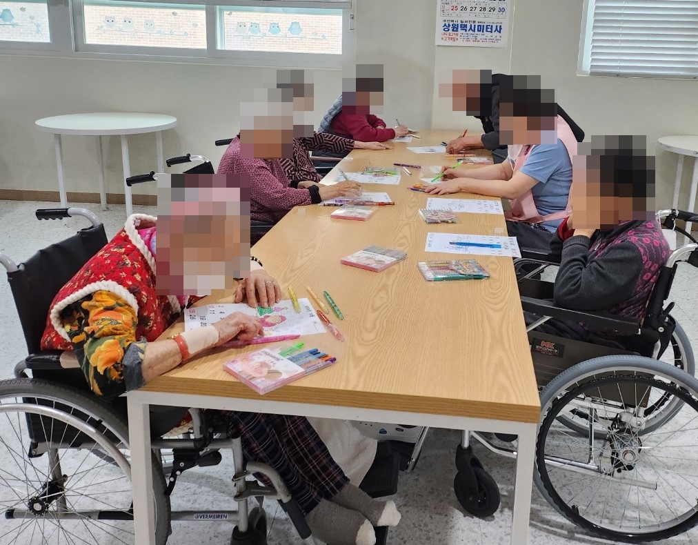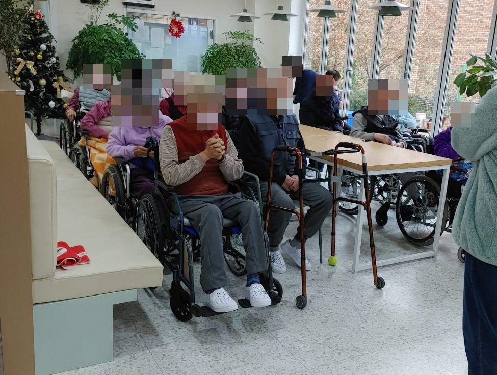 23. 12. 8. (금) 예배오늘은 어르신들의 종교활동으로 동두천감리교회 이양로 목사님과 함께 예배를 드렸습니다.어르신들께서 찬송가도 부르시고, 성경구절 봉독을 하시며 목사님이 전해주시는 말씀을 집중해서 들으셨습니다.어르신들의 기도가 이루어지기를 기원합니다.예배에 참여하지 않으시는 분들께서는 각 층에서 달력 색칠하기를 하시거나 휴식을 취하셨습니다.