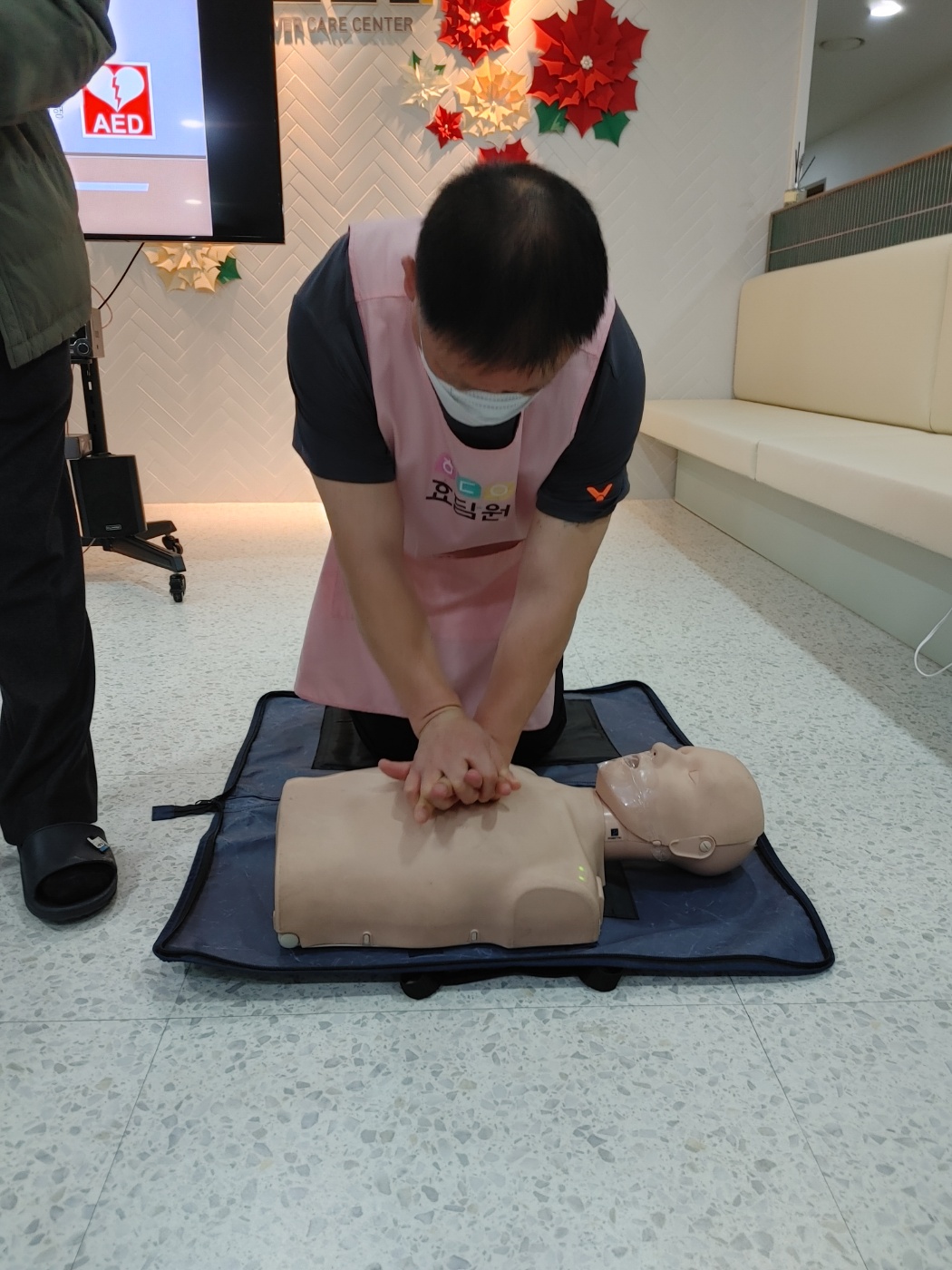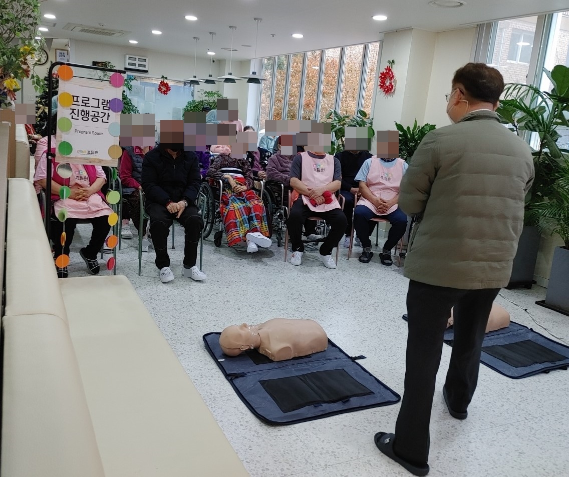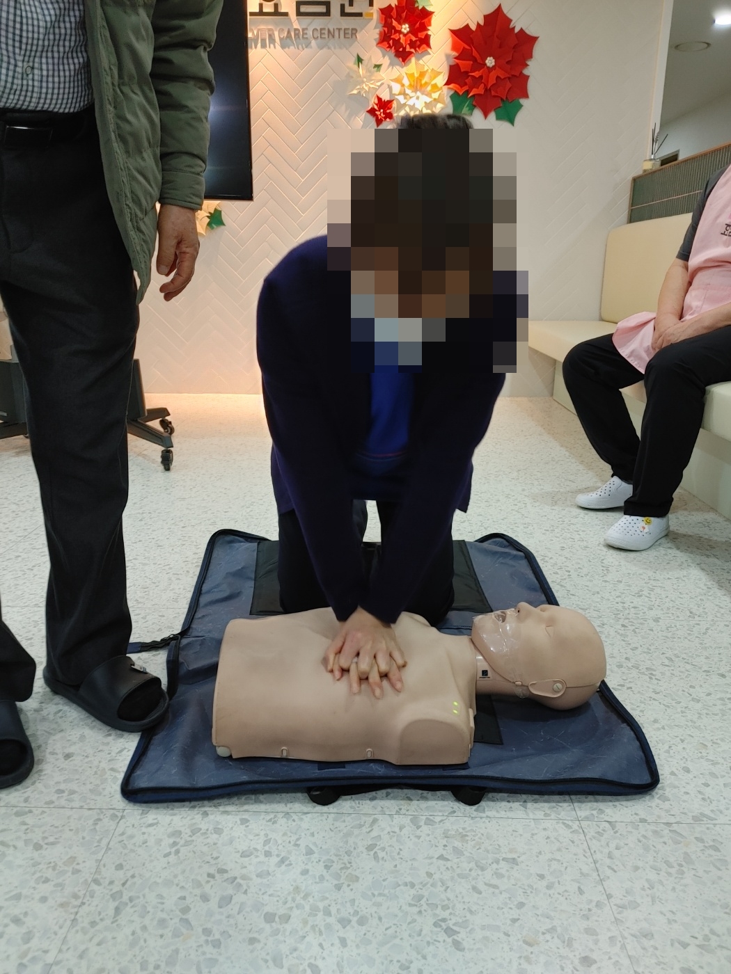 23. 12. 11. (월) 소방안전교육종사자와 어르신들이 모두 참석하여 소화기 사용법과 화재 시 대피요령, 심폐소생술과 하임리히요법에 대한 교육을 받았습니다.어르신들께서 종사자들이 심폐소생술 연습을 하는 것도 관심 있게 보시며 교육 시간 동안 정말 집중하여 들으시는 모습이 멋지셨습니다. ദ്ദിᐢ._.ᐢ₎