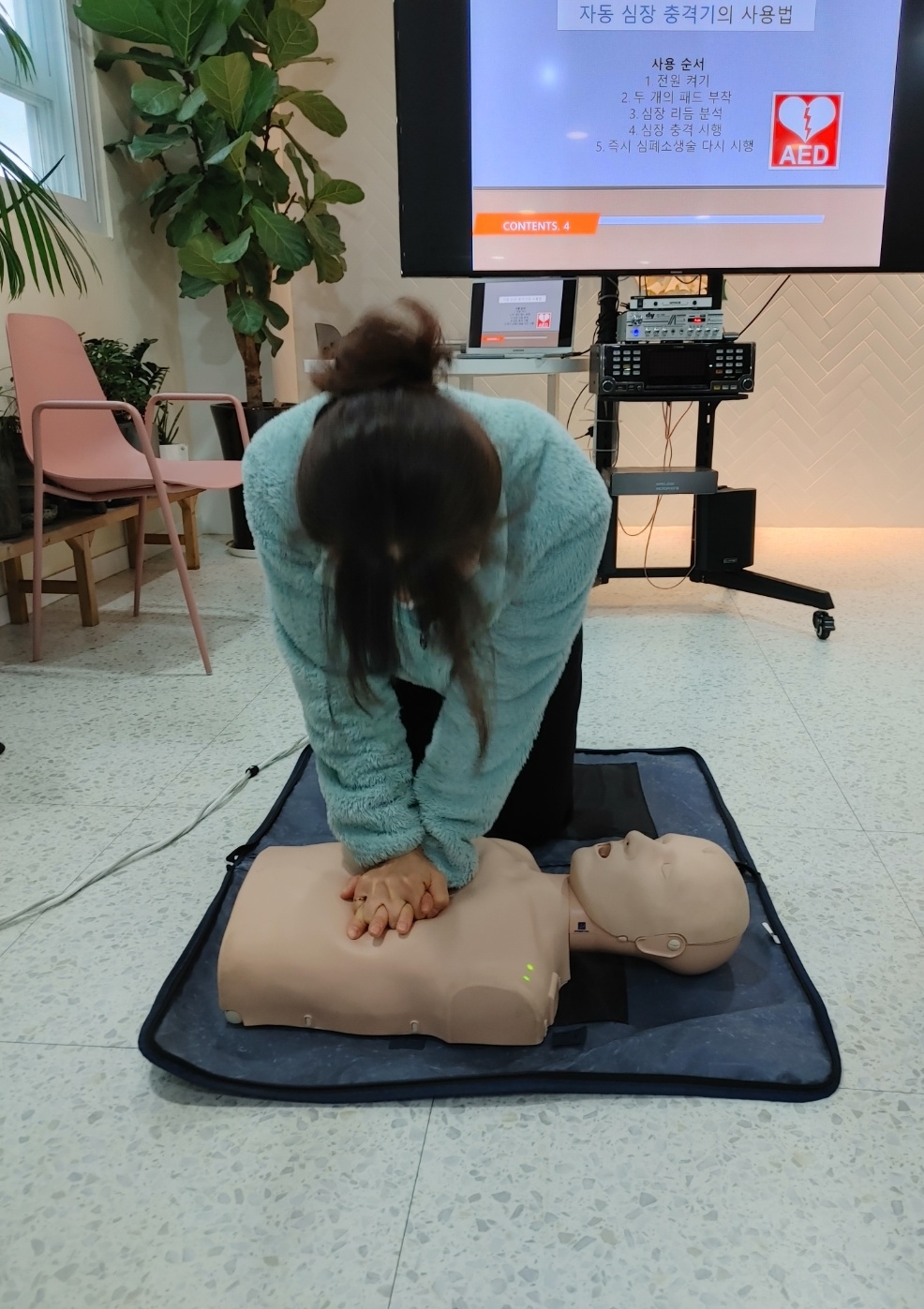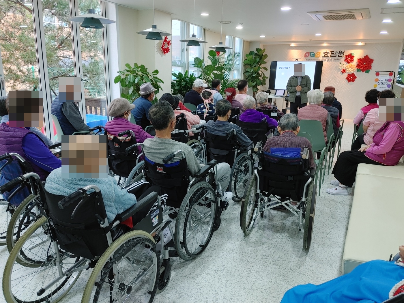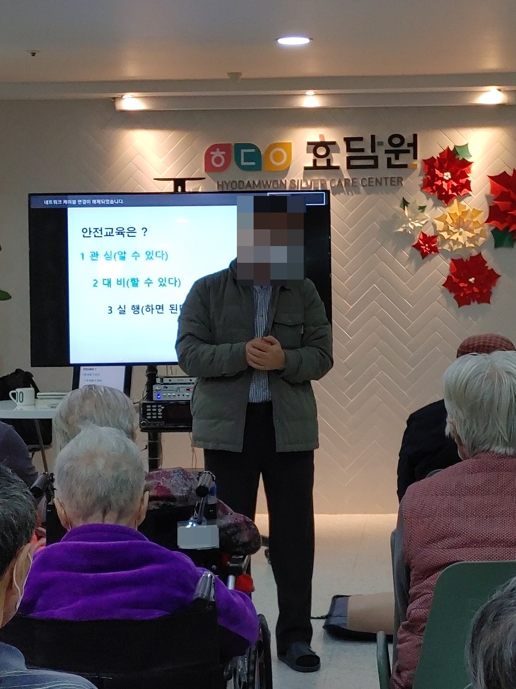 23. 12. 11. (월) 소방안전교육종사자와 어르신들이 모두 참석하여 소화기 사용법과 화재 시 대피요령, 심폐소생술과 하임리히요법에 대한 교육을 받았습니다.어르신들께서 종사자들이 심폐소생술 연습을 하는 것도 관심 있게 보시며 교육 시간 동안 정말 집중하여 들으시는 모습이 멋지셨습니다. ദ്ദിᐢ._.ᐢ₎