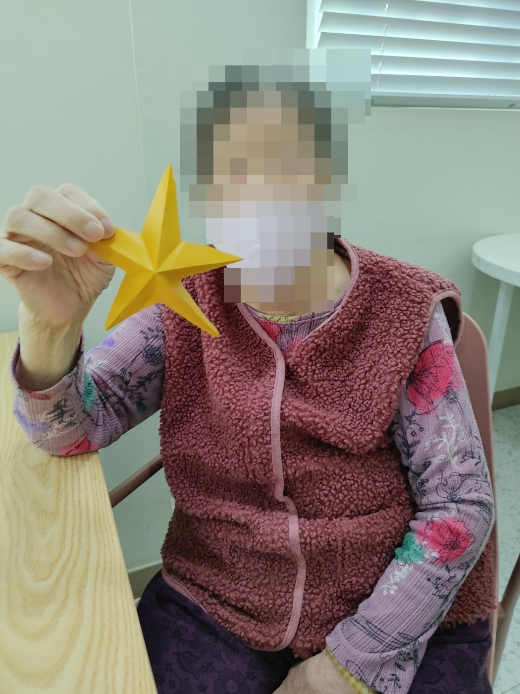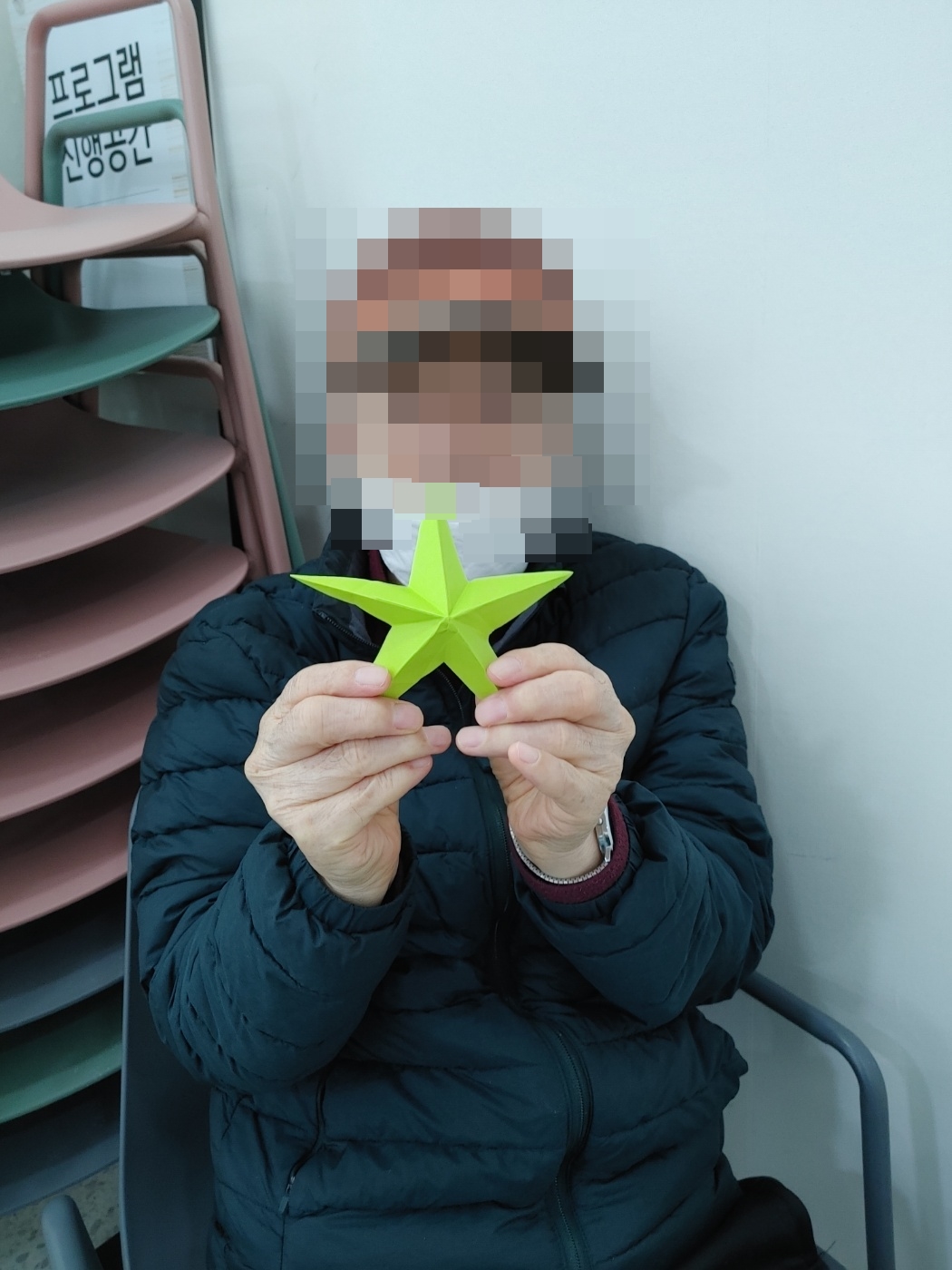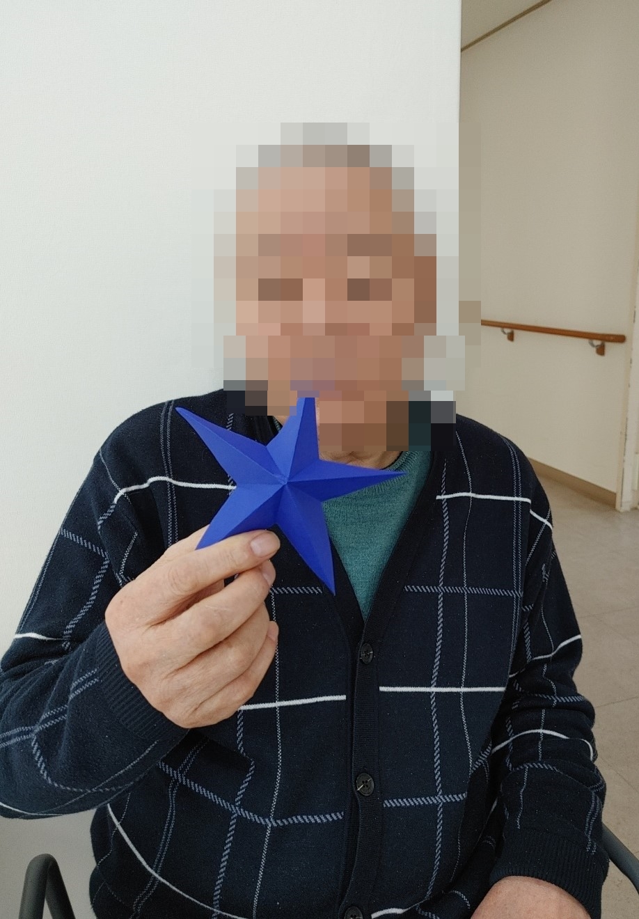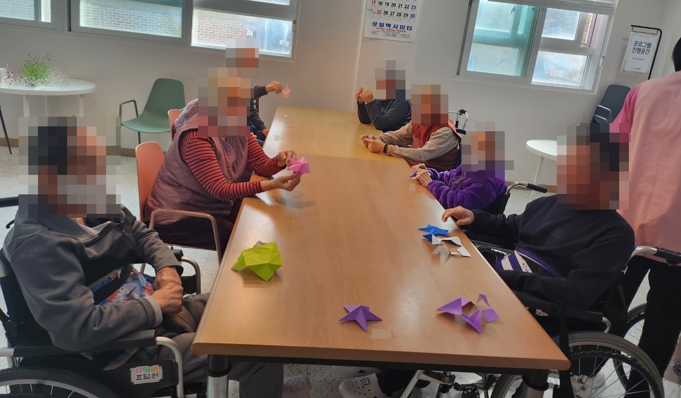 23. 12. 18. (월) 종이접기오늘 오후 프로그램 시간에는 코앞으로 다가온 성탄절과 연말을 위해 색종이로 예쁘게 별을 접었습니다.색종이를 접는 동안은 어르신들께서 다소 어려워하셨지만 예쁘게 완성된 별을 보시며 모두 흐뭇해하셨습니다.