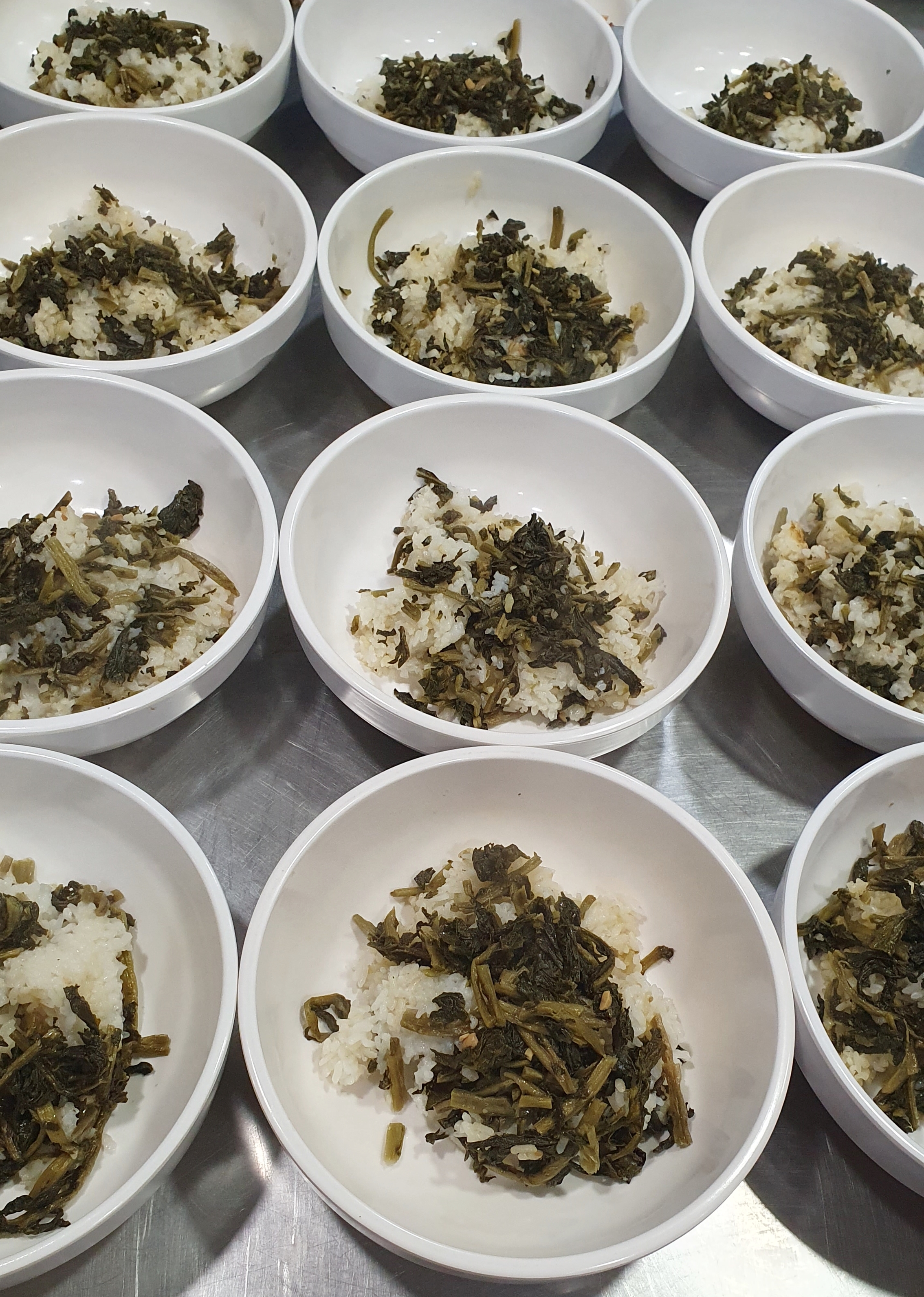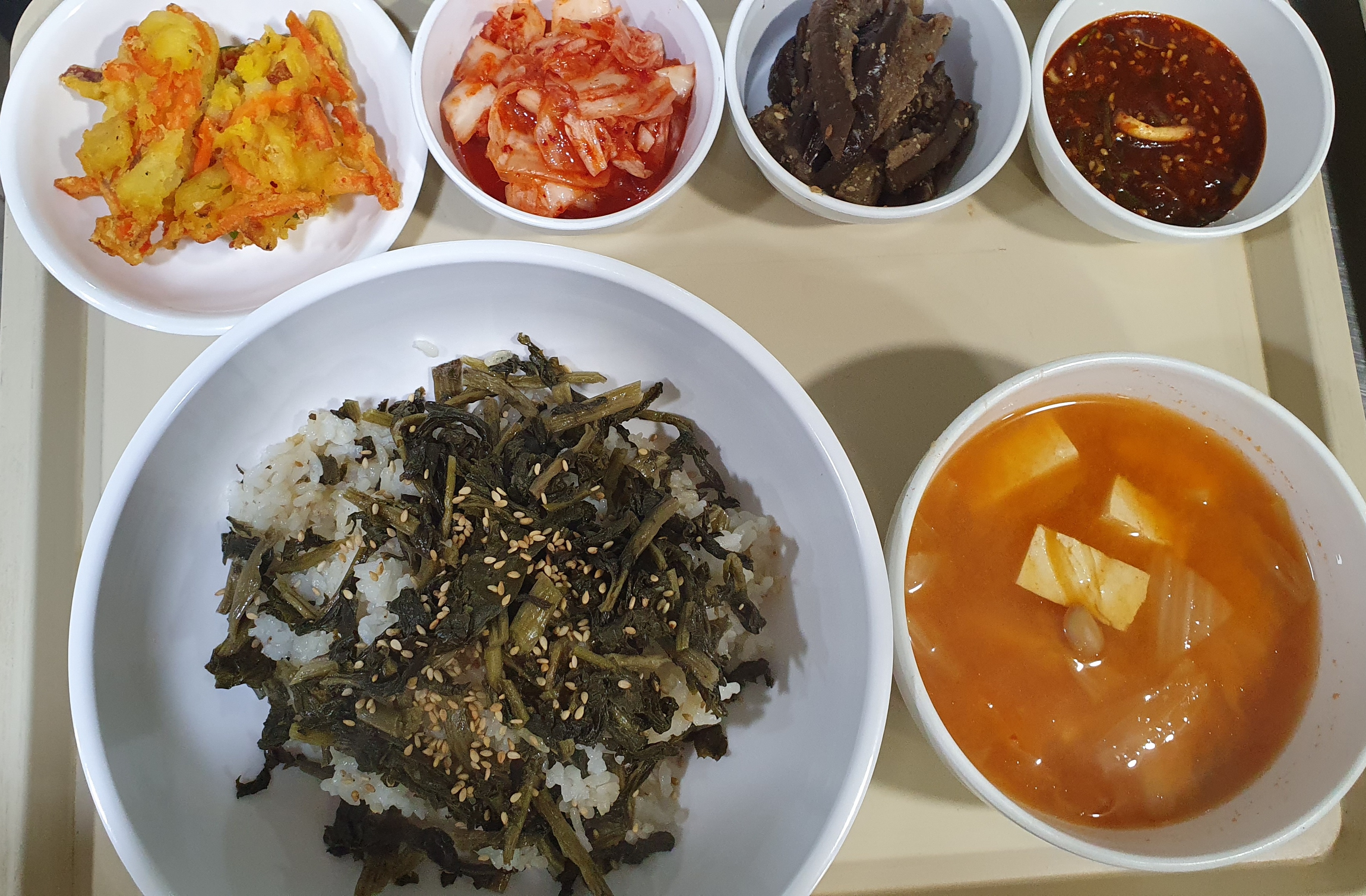 24. 2. 19. (월) 특식 '시래기 비빔밥 정식'오늘 점심시간에는 간장 양념을 곁들인 시래기 비빔밥 정식이 특식으로 제공되었습니다.잘게 다진 시래기를 듬뿍 얹은 밥에 조리사 선생님 특제 달래 양념장을 쓱싹 비비고,거기에 구수한 냄새가 일품인 청국장을 한 술 떠서 입에 넣으면~~이것이 바로 건강하게 맛있는 맛이죠! ദ്ദി*ˊᗜˋ*)