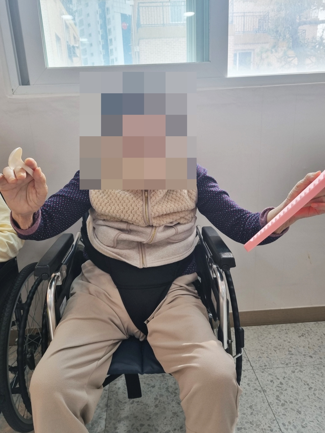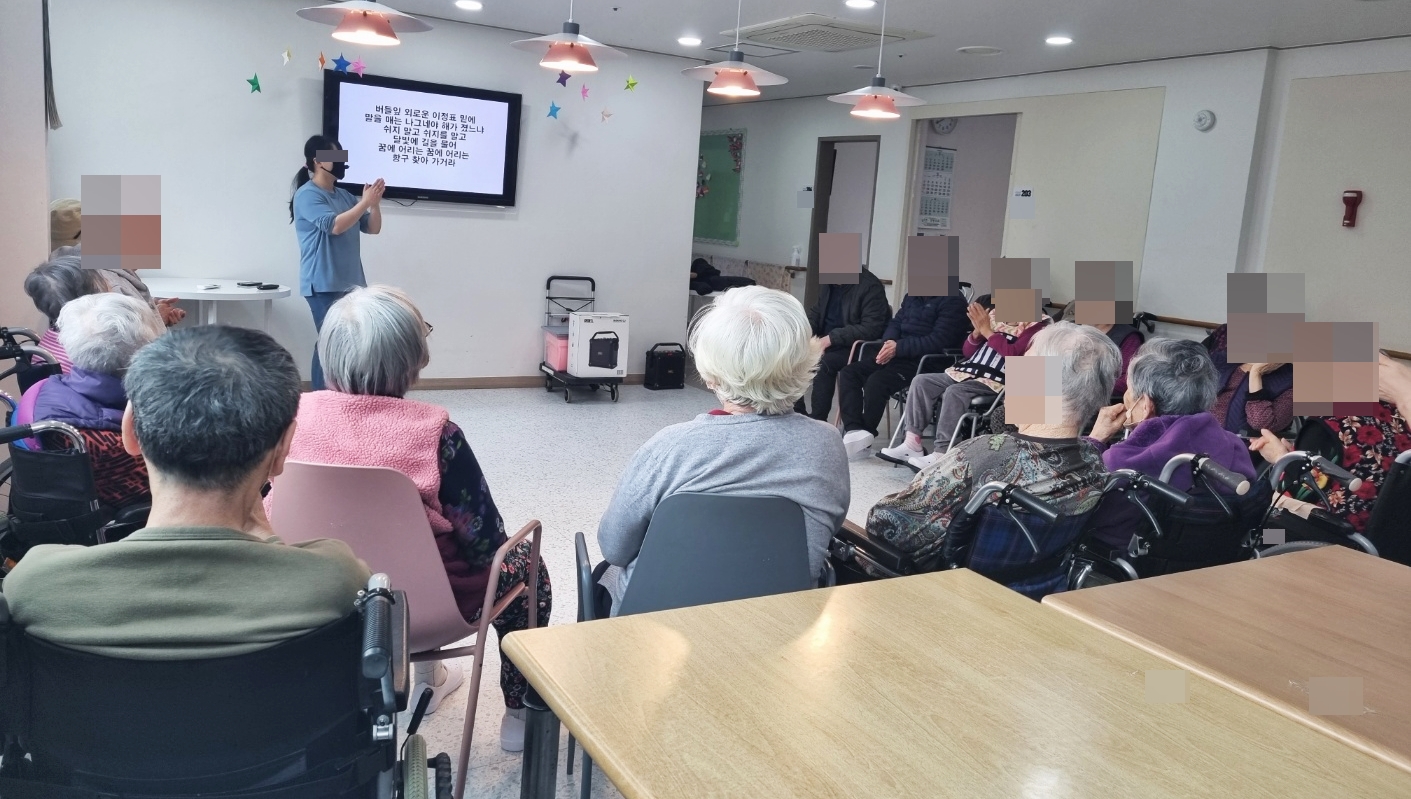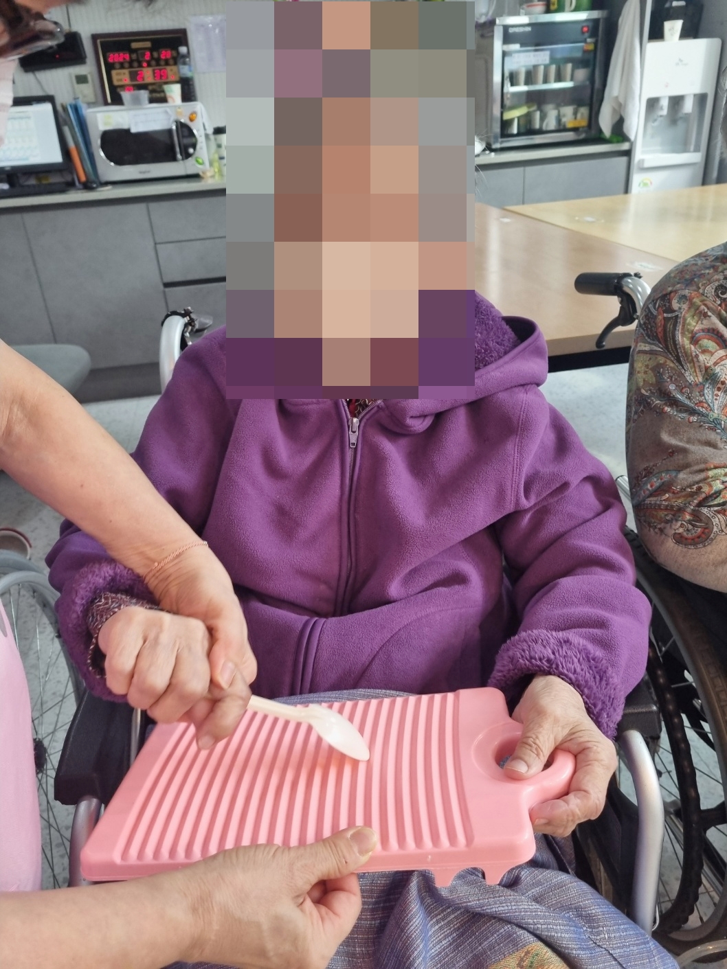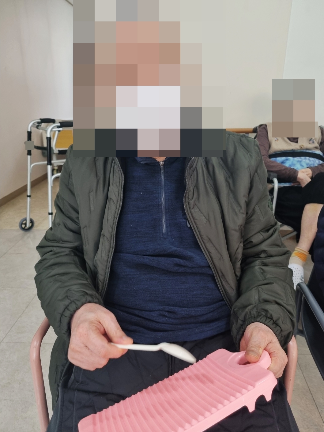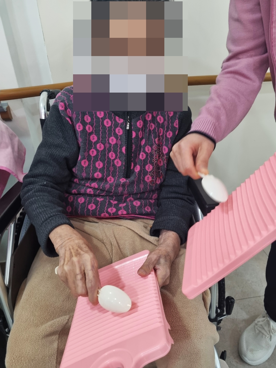 24. 2. 28. (수) 음악치료오늘 사용된 노래는 음이 재미있는 <뱀이다> 노래와어르신들의 향수를 자극하는 <대지의 항구> 노래였습니다.가사를 천천히 읽어보며 가사의 느낌을 되새겨보고, 노래에 맞춰 숟가락으로 빨래판을 긁어보며두뇌기능을 깨우면서 스트레스도 해소하는 시간이었습니다.