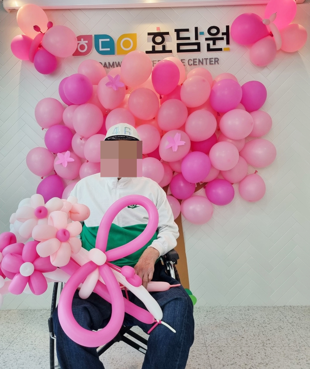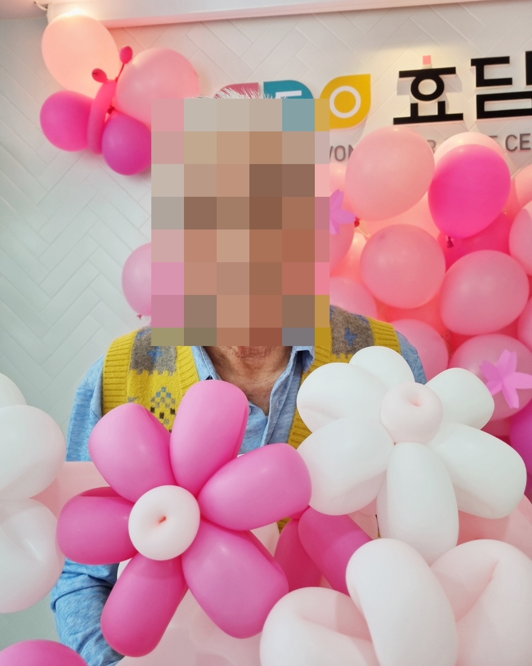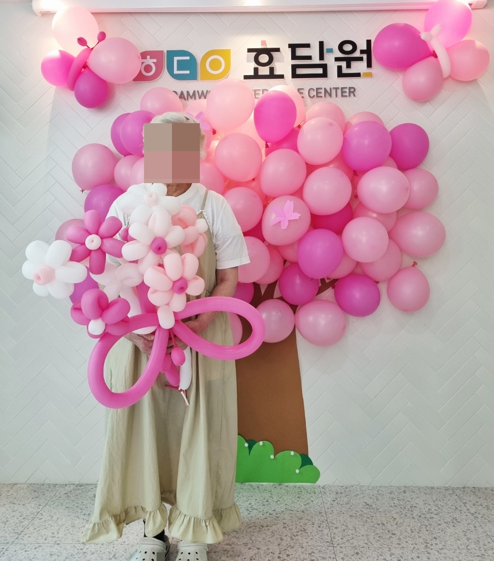 풍선으로 꾸민 벚나무 아래에서 풍선꽃을 든 어르신들의 모습이