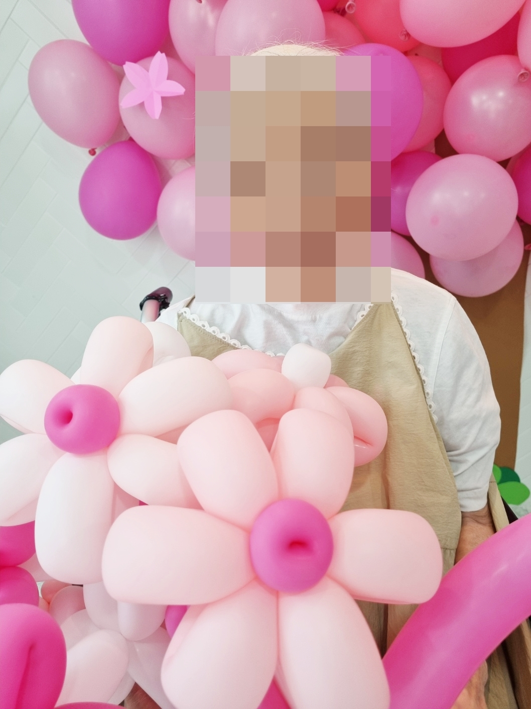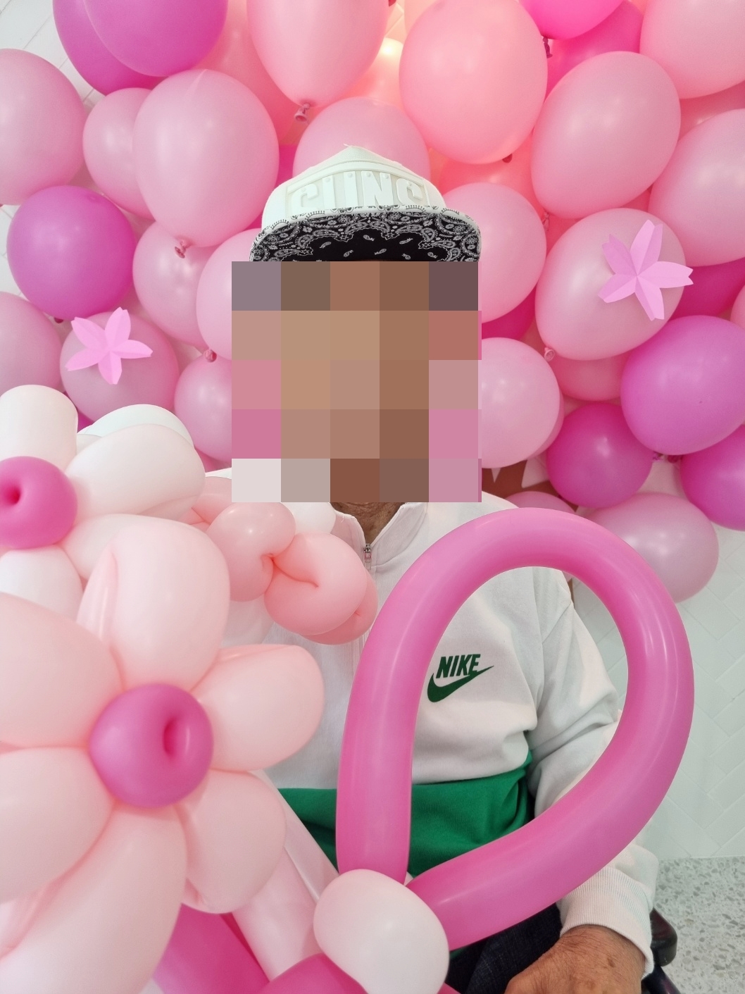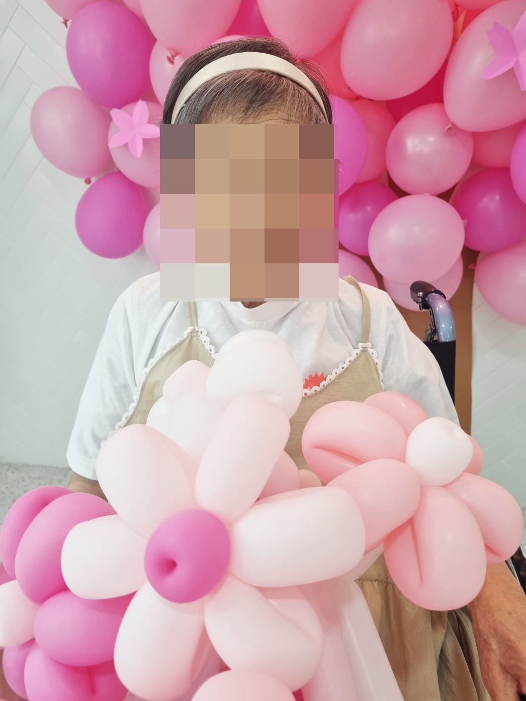 풍선으로 꾸민 벚나무 아래에서 풍선꽃을 든 어르신들의 모습이
