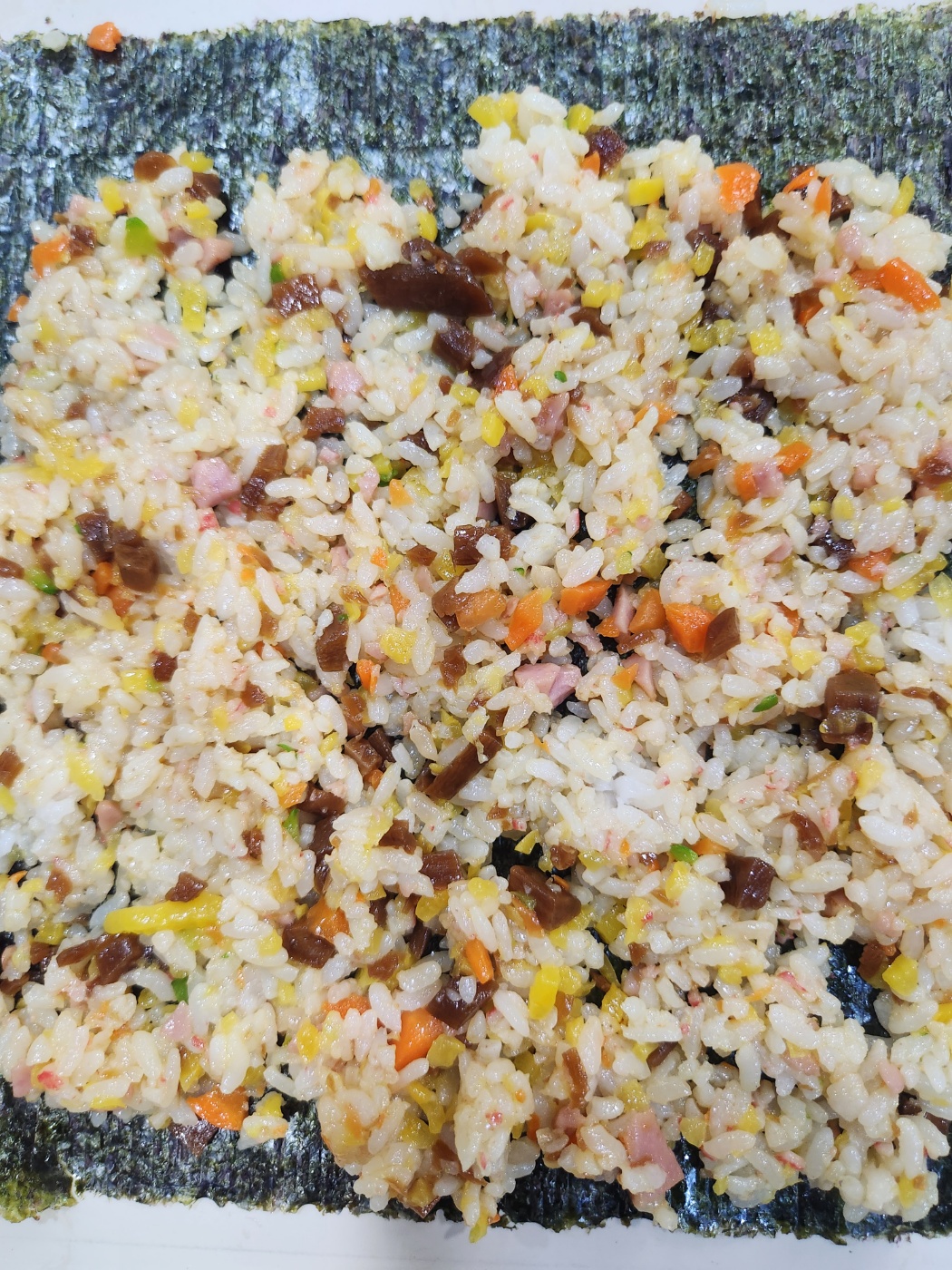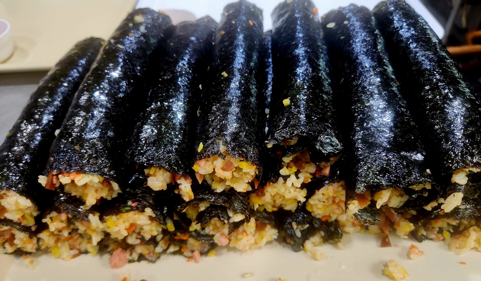 모든 재료는 잘게 다져 밥과 함께 섞어 작게말아 얇게 썰어 드렸습니다.