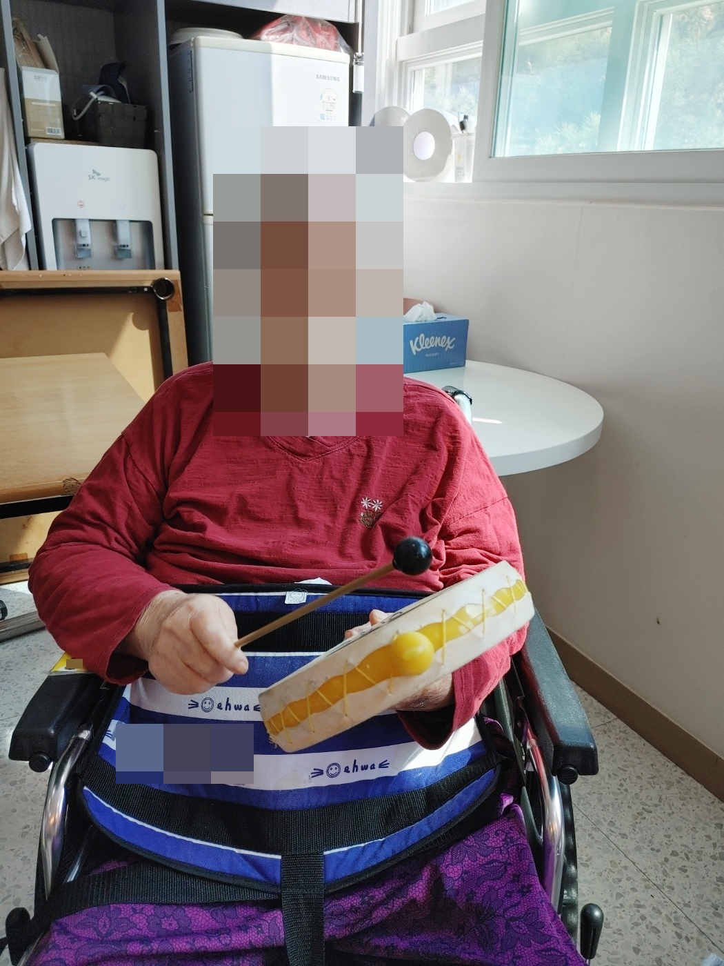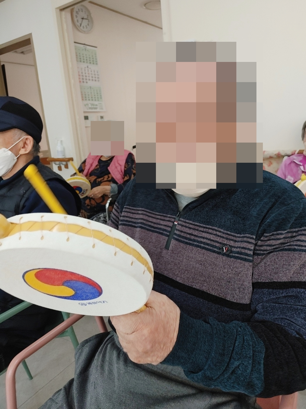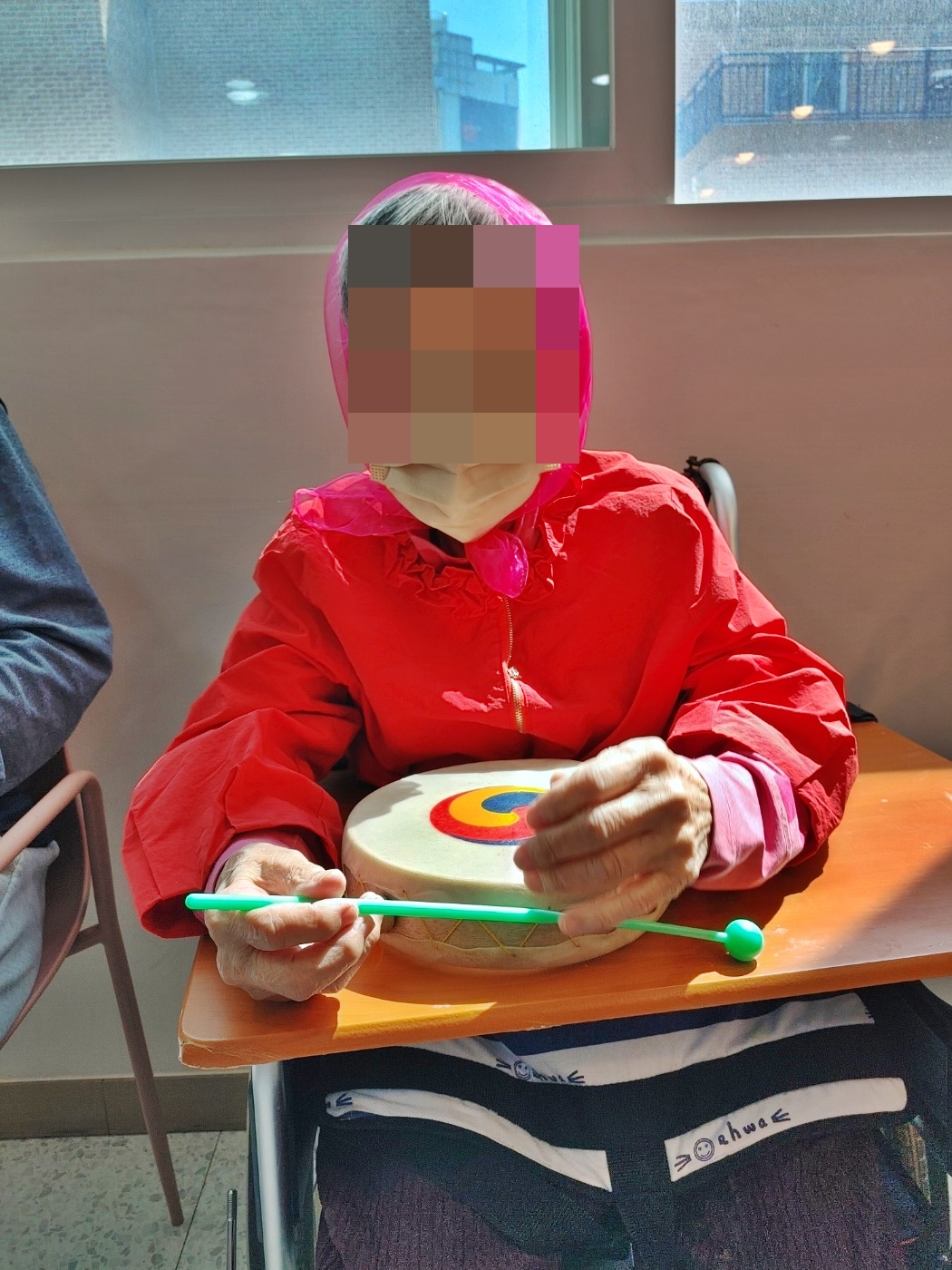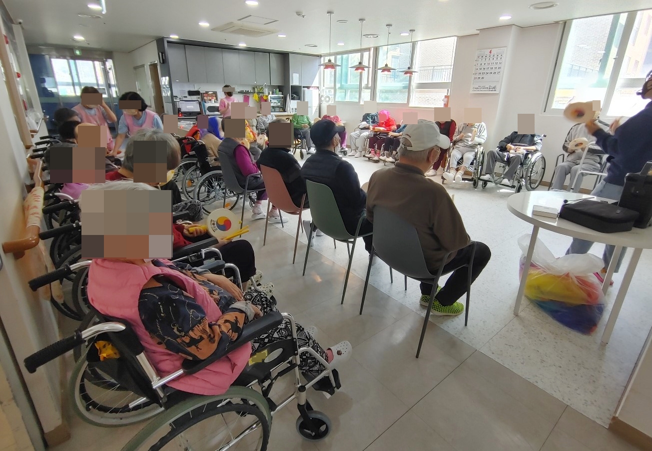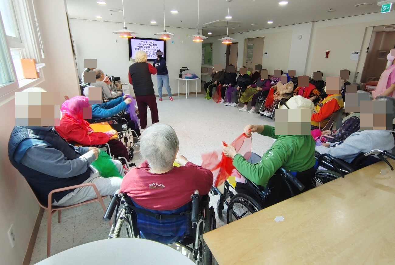 24. 4. 9. (화) 음악치료오늘의 노래는 백설희 님의 <봄날은 간다> 노래였습니다.향수를 자극하는 노래와 함께 색색의 천을 흔들며 감성에 젖으셨다가,소고 치시며 분위기를 전환하시어 시간이 흐르는지 모르셨습니다~~^^