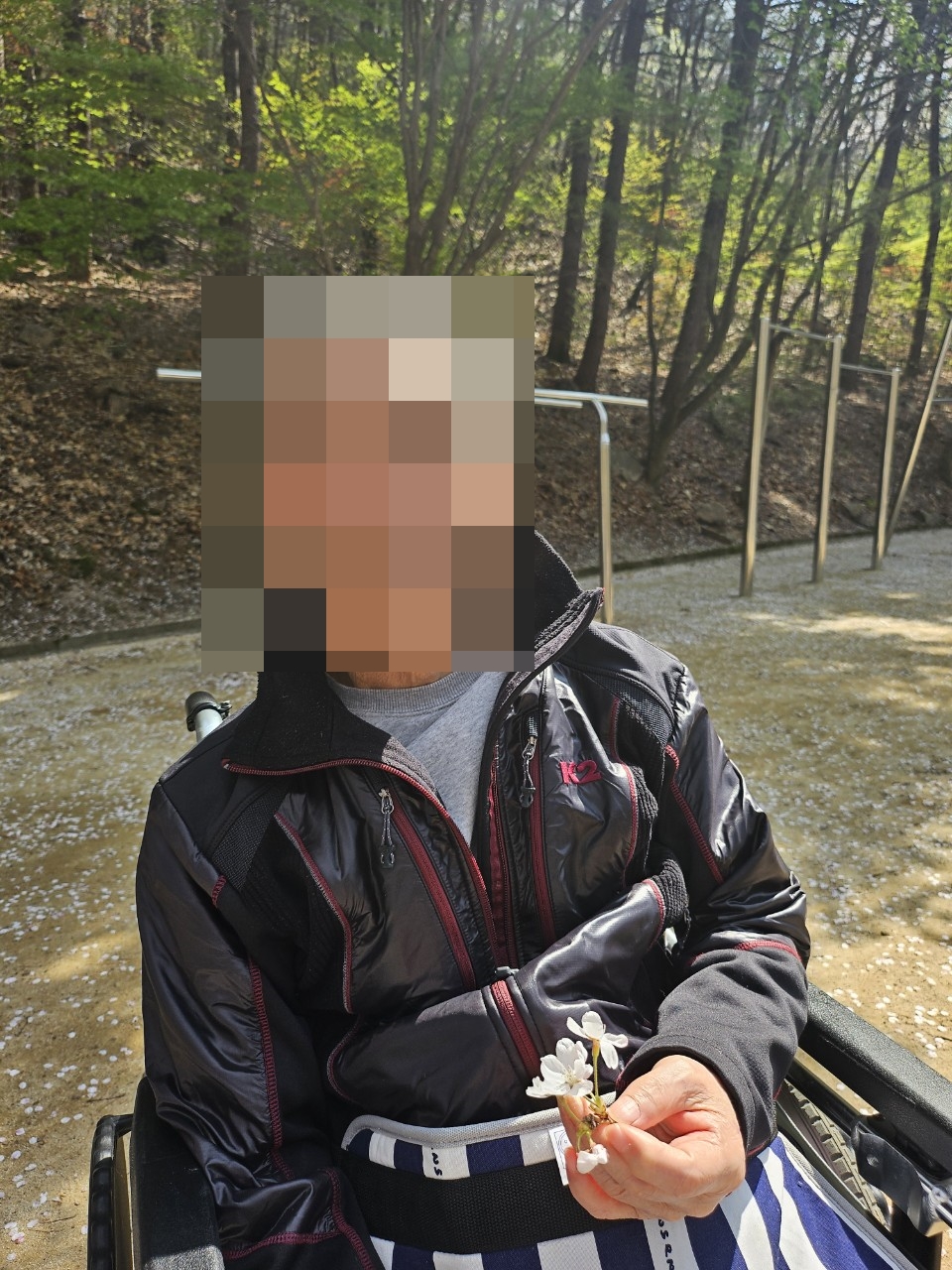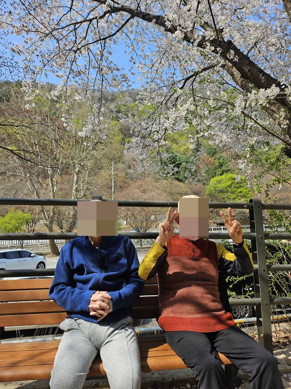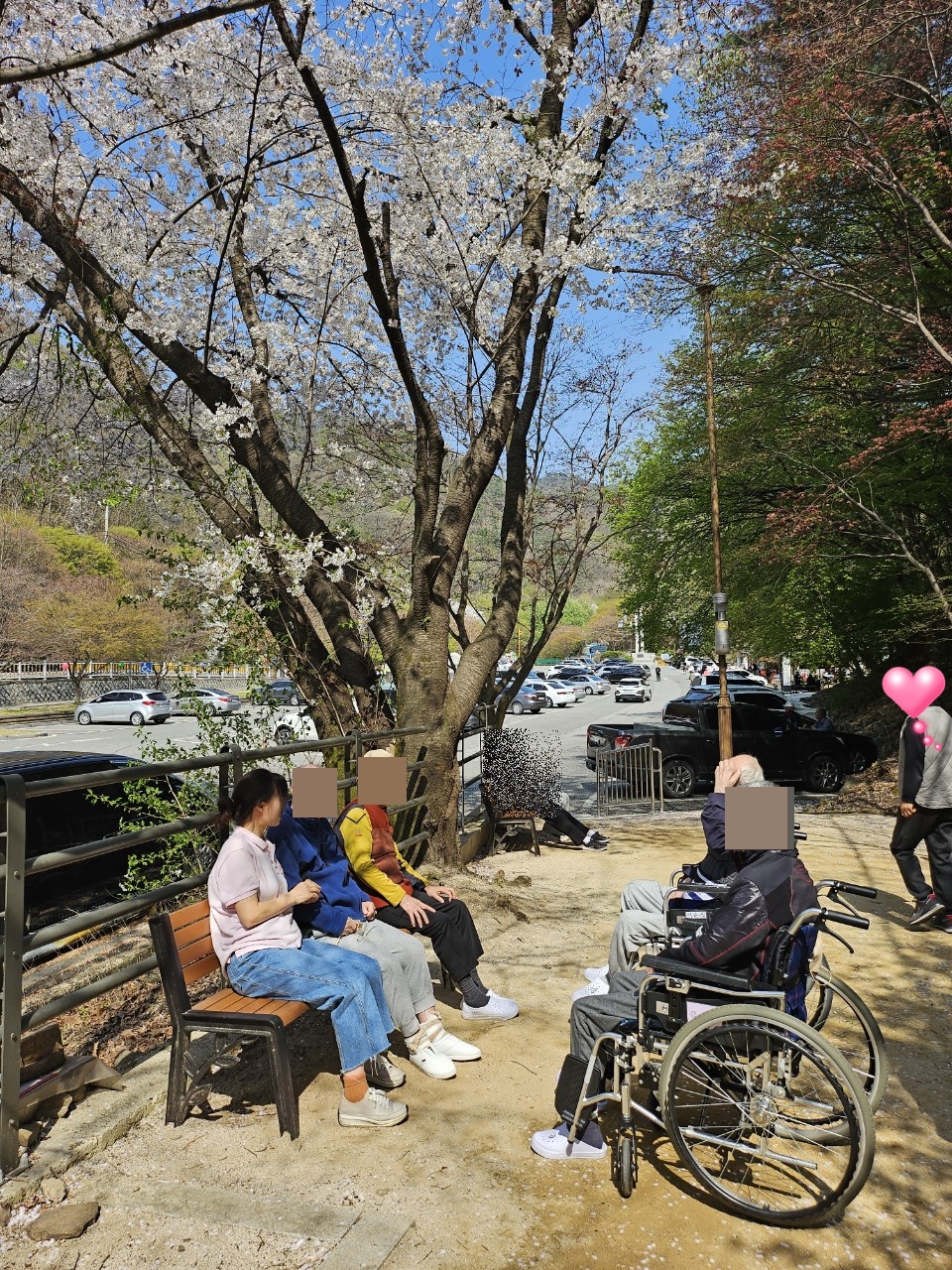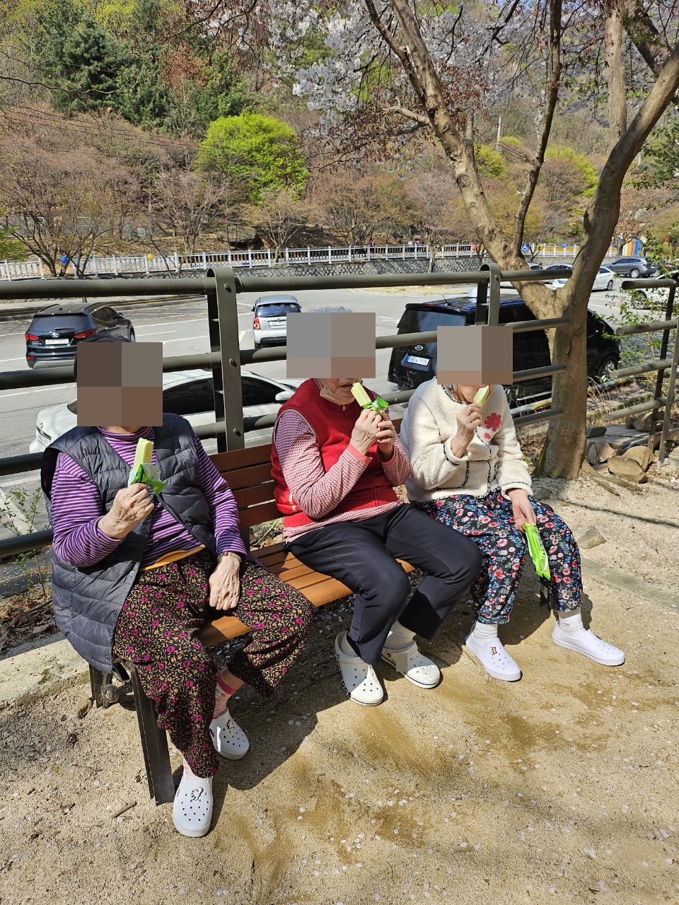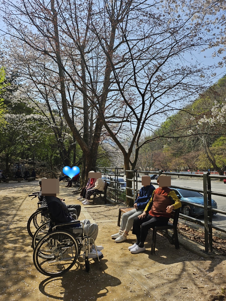 24.04.12(금) 두번째 꽃놀이날씨가 너무 좋아서 그냥 넘어갈 수가 없네요~두번째 꽃놀이를 다녀왔습니다.(네번째까지 계획하고 있습니다~그때까지 꽃잎이 기다려줘야 하는데오...^^)살랑사랑 바람에 꽃비가 쏟아지니여자 어르신은 절로 탄성을 지르십니다."와아~~저거봐라~~""6년만에 꽃구경 나가는거야~""고마워~""막걸리랑 파전 좀 사와봐~"어르신은 막걸리를 원하셨지만메로나 한입으로 아쉬움을 달래고 돌아왔습니다~