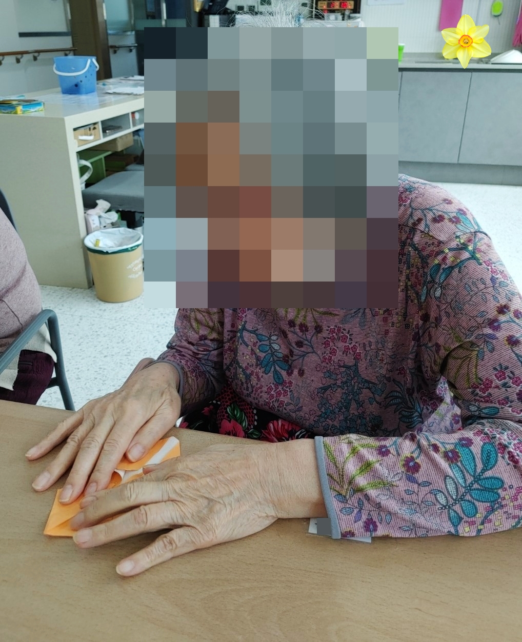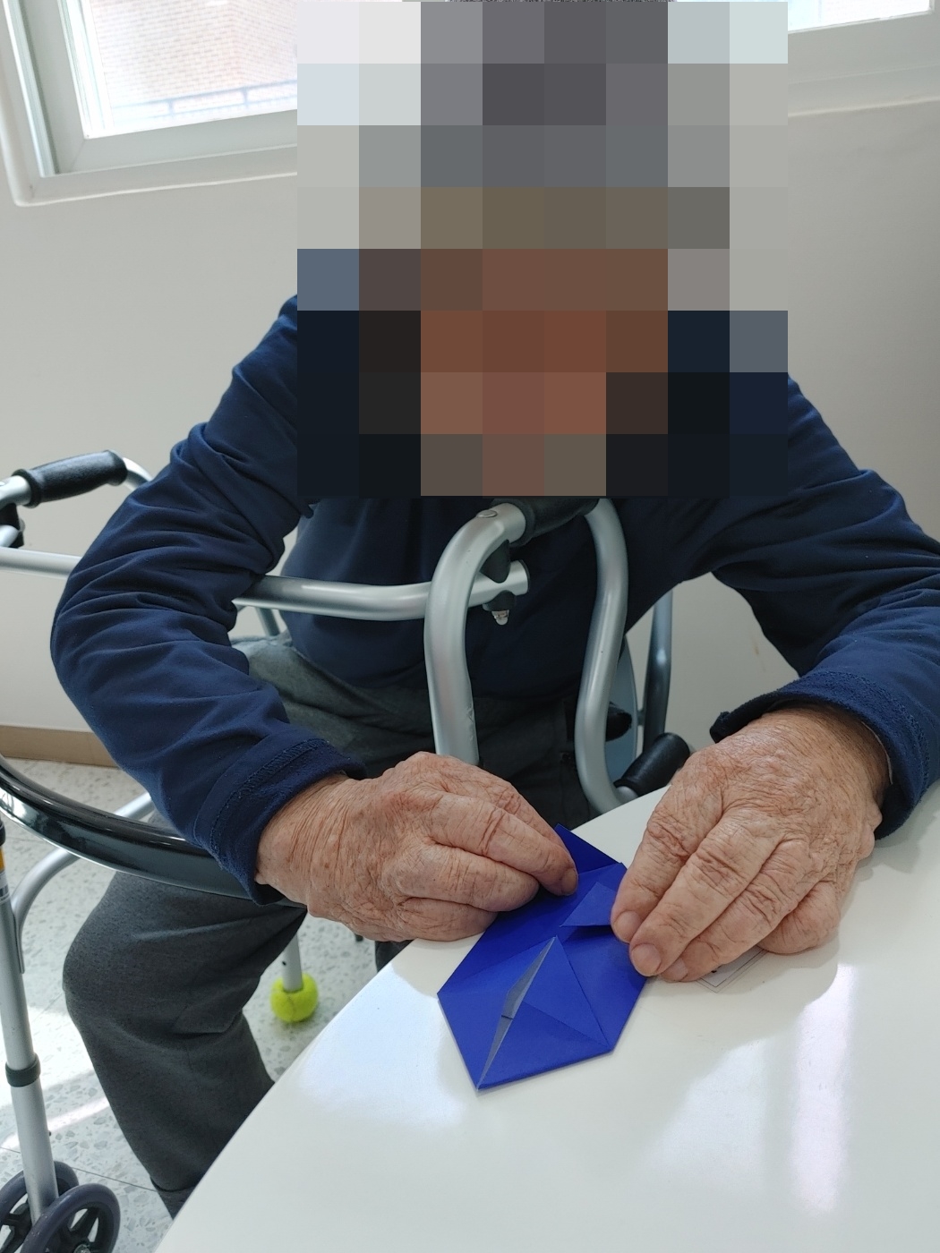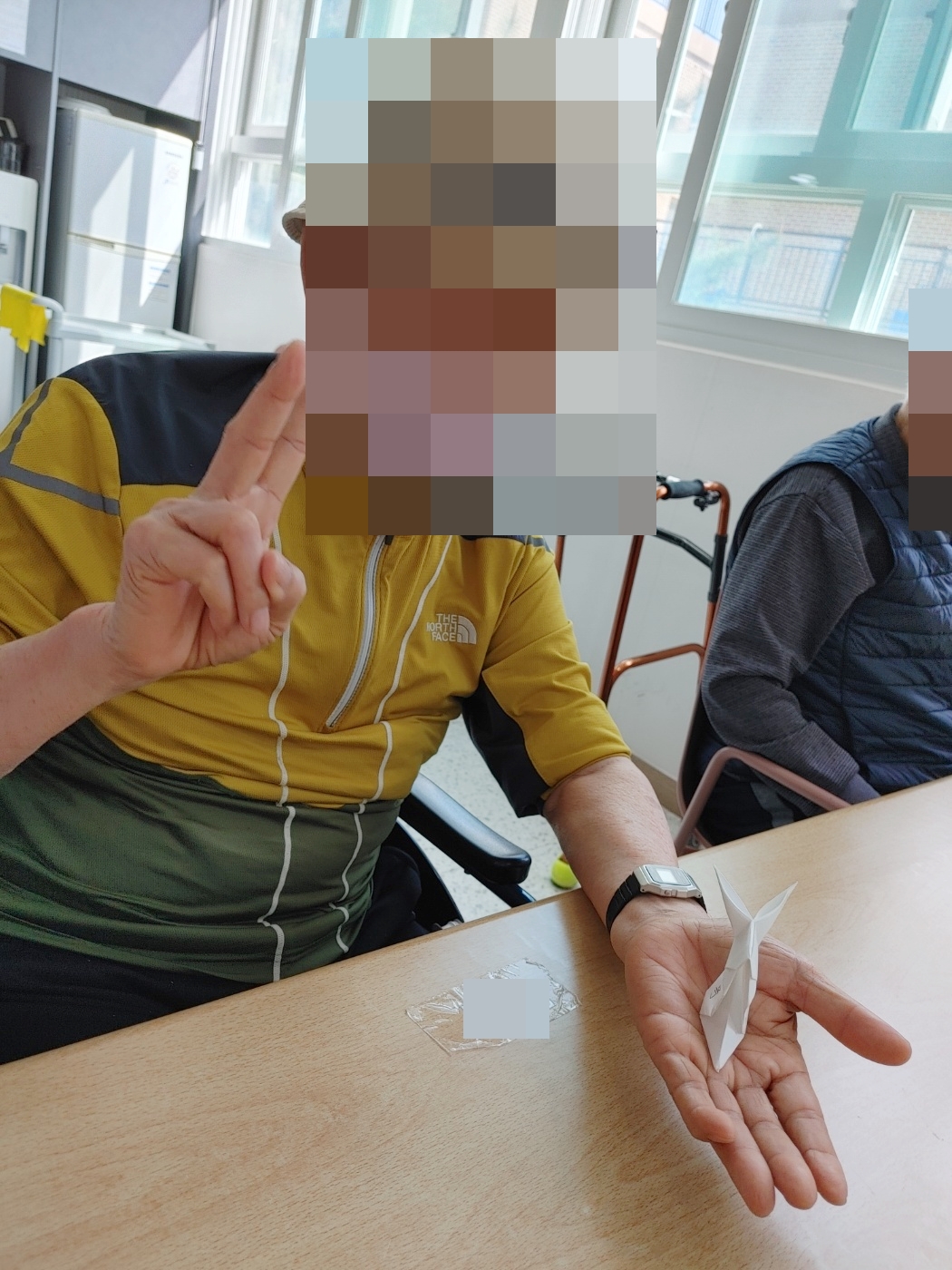 24. 4. 18. (목) 종이접기날씨가 덥지만 그래도 봄은 봄이죠~오늘은 색종이로 봄토끼를 접었습니다."어우 토끼네!! 어구 귀여워라~""토끼 좀 이리 데려온나""토끼 구워먹으려고?"샘플로 접은 토끼에 시선을 집중하시며 엉뚱한 반응도 있으셨는데요,대부분 귀엽다는 감탄과 함께 의욕이 샘솟으셨습니다.의욕과 달리 어려운 부분들이 있어 도움을 받으셨지만, 완성된 토끼가 서있는 모습을 보시며 뿌듯해하셨습니다 :D