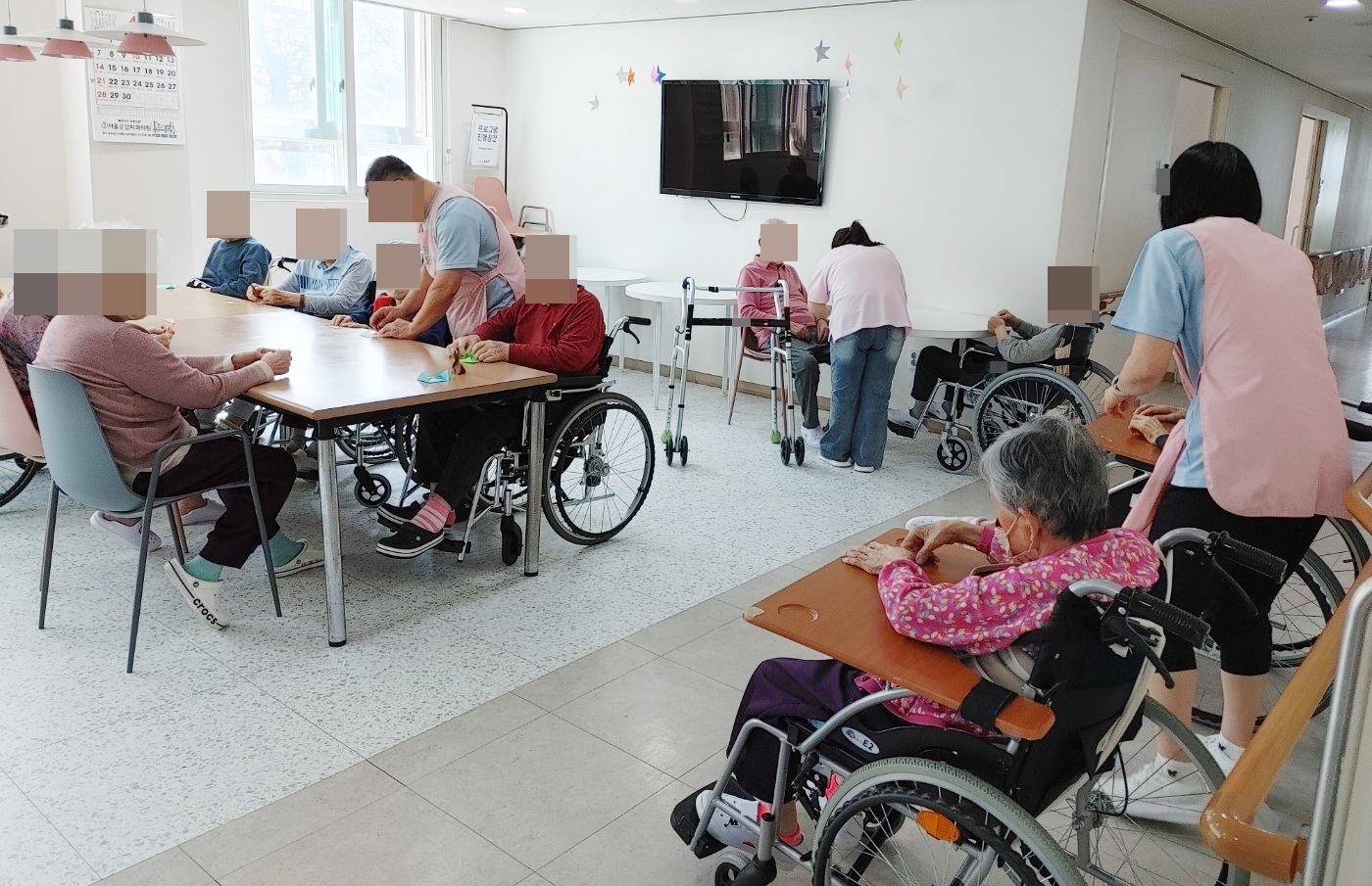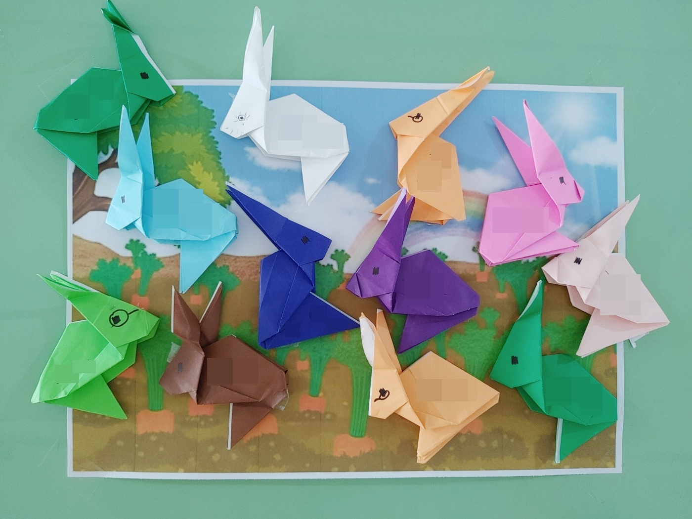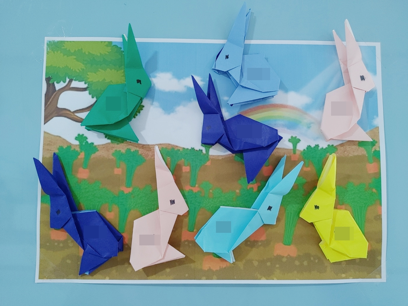 24. 4. 18. (목) 종이접기날씨가 덥지만 그래도 봄은 봄이죠~오늘은 색종이로 봄토끼를 접었습니다."어우 토끼네!! 어구 귀여워라~""토끼 좀 이리 데려온나""토끼 구워먹으려고?"샘플로 접은 토끼에 시선을 집중하시며 엉뚱한 반응도 있으셨는데요,대부분 귀엽다는 감탄과 함께 의욕이 샘솟으셨습니다.의욕과 달리 어려운 부분들이 있어 도움을 받으셨지만, 완성된 토끼가 서있는 모습을 보시며 뿌듯해하셨습니다 :D